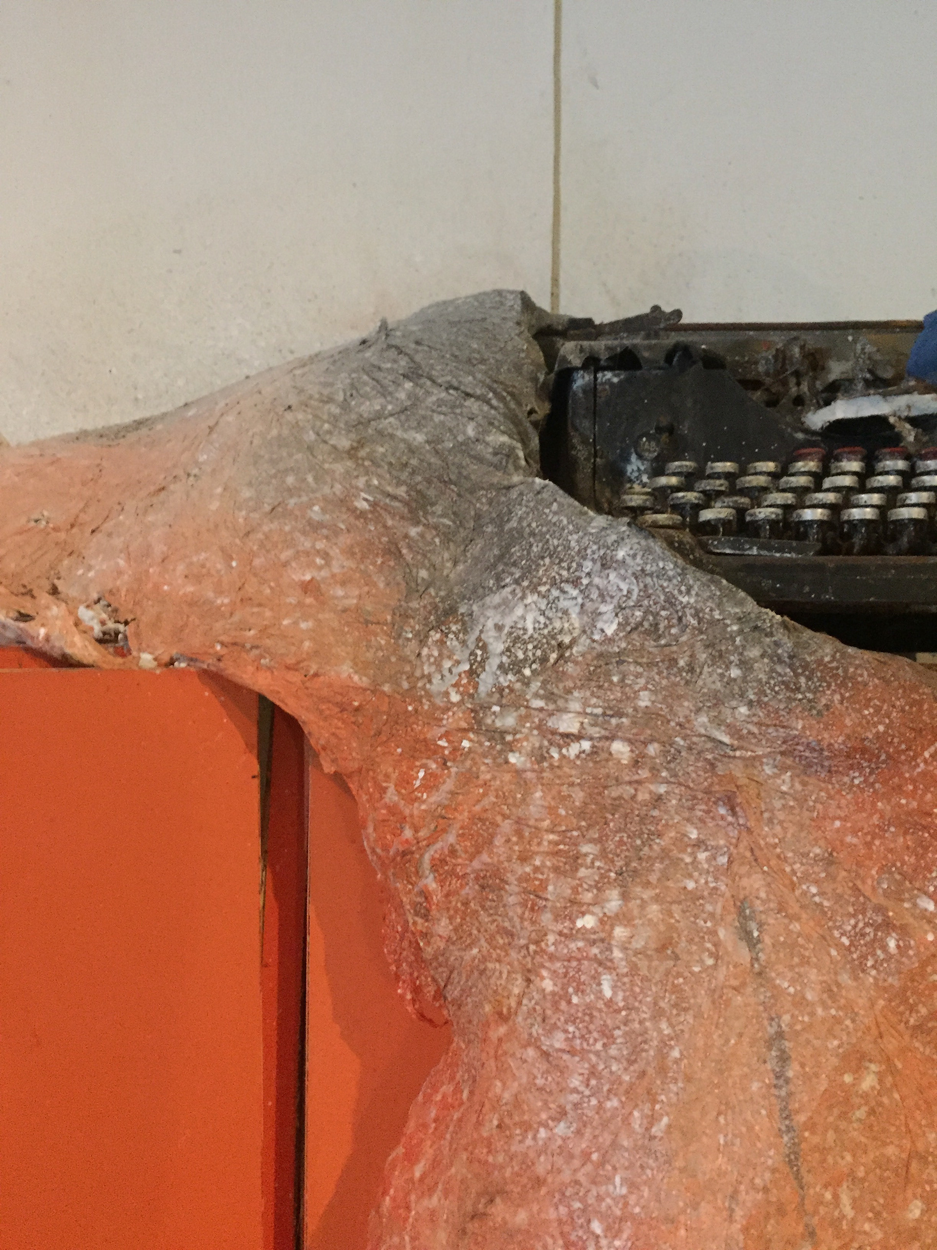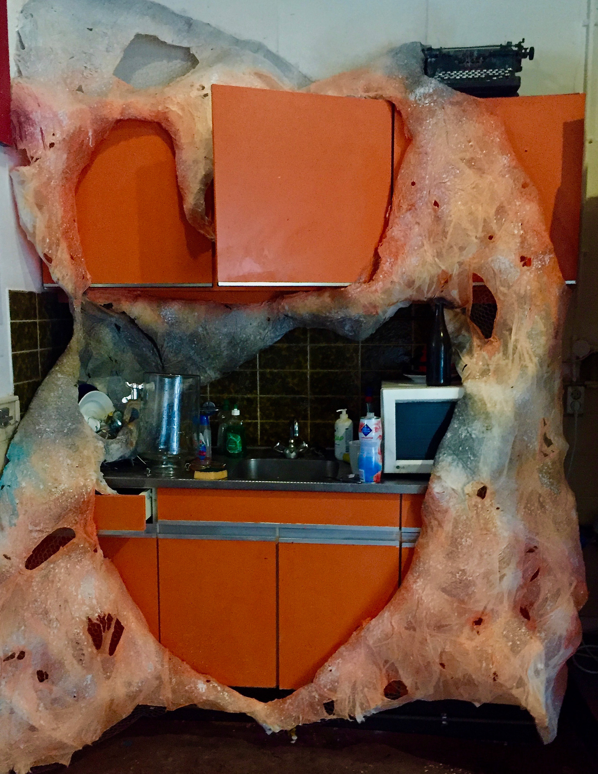 a sculpture that explored the relationship between people and the unknown. the statue looked like a parasitic life form taking over a kitchen unit, but in reality it was looking for affection.